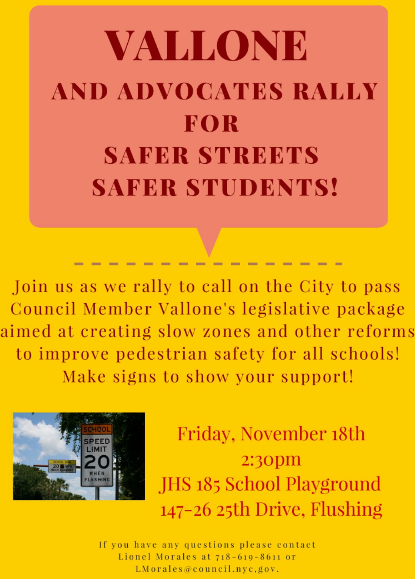 Today, November 18, at 2:30pm, Council Member Paul Vallone is holding a “School Safety for All” rally in support of a package of legislation aimed at improving pedestrian safety around all schools throughout the City. Come show your support at J.H.S. 185’s School Playground (147-26 25th Drive, Flushing, NY 11354).