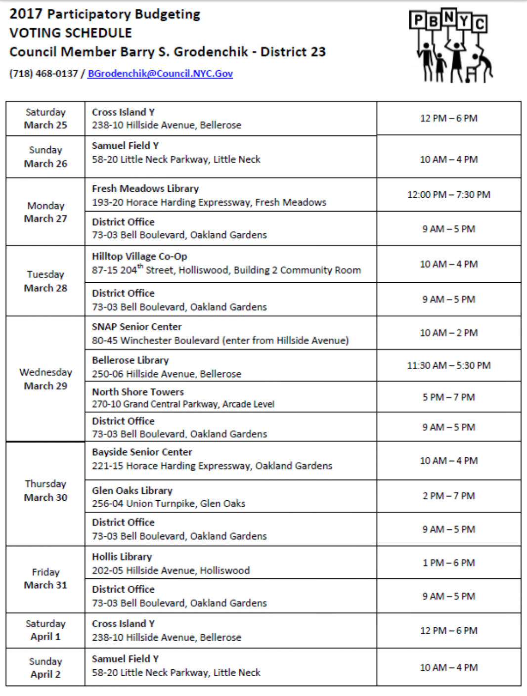 Here are the voting locations (for more information contact BGrodenchik@Council.NYC.gov)