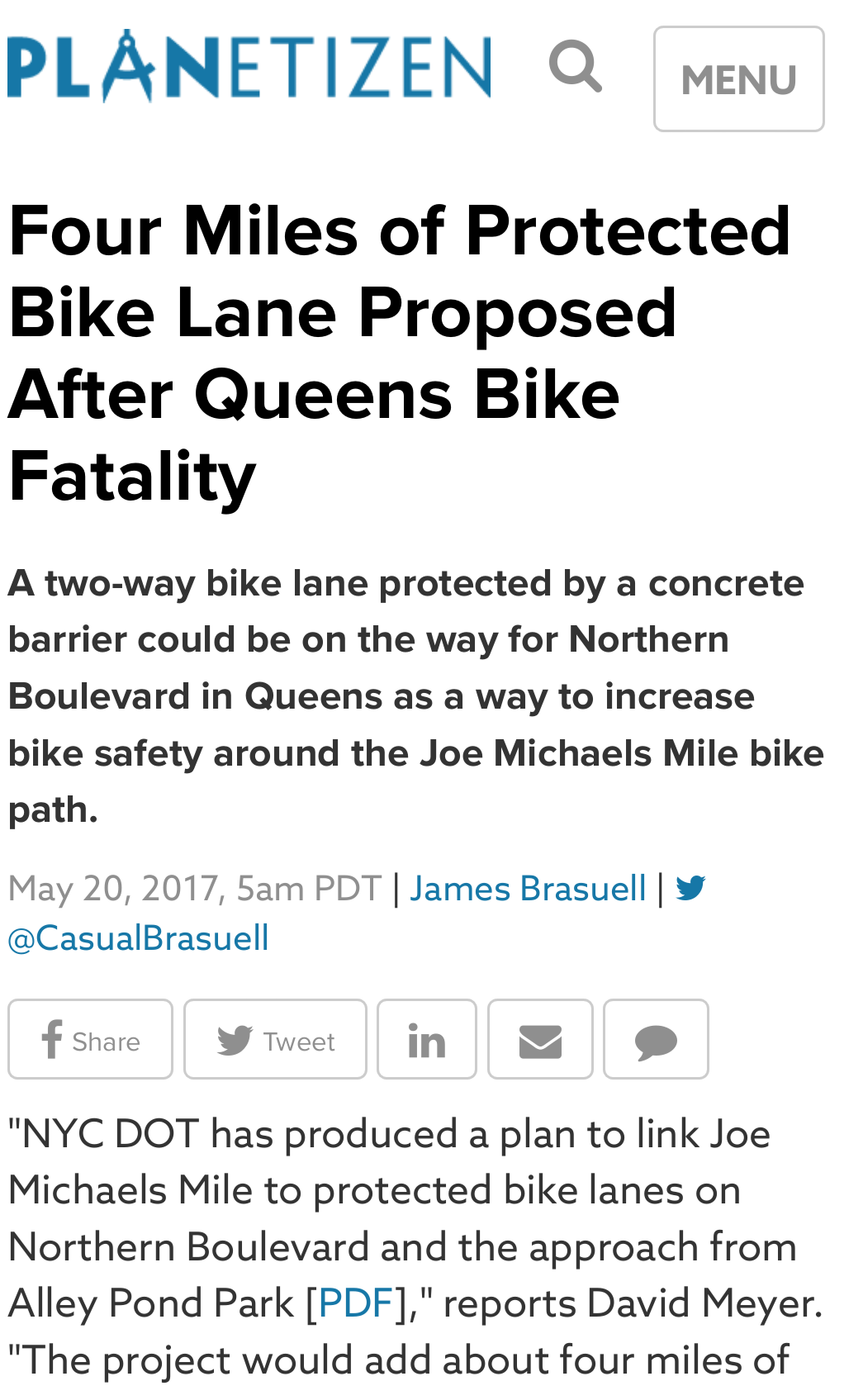 The infrastructure improvements on Northern Boulevard and along Cunningham Park are getting incredibly poplar in our neighborhood. The Department of Transportation’s plan was recently highlighted in multiple media outlets.