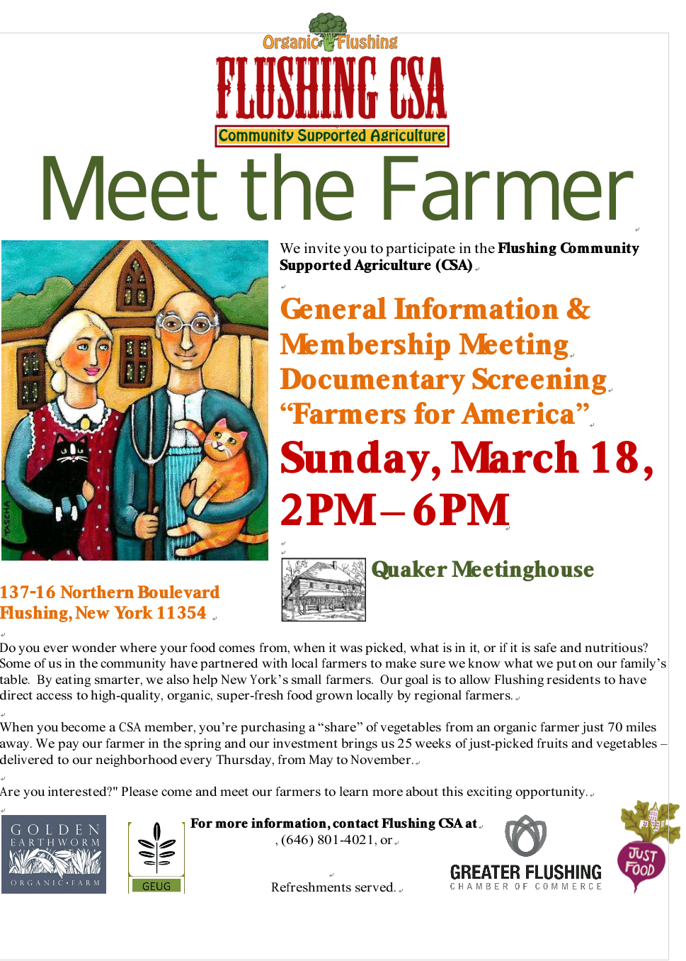 If you want the freshest, best tasting, and most environmentally friendly food, you should come to the Flushing Quaker Meeting House on Sunday, March 18th for three ways to better understand your food.
