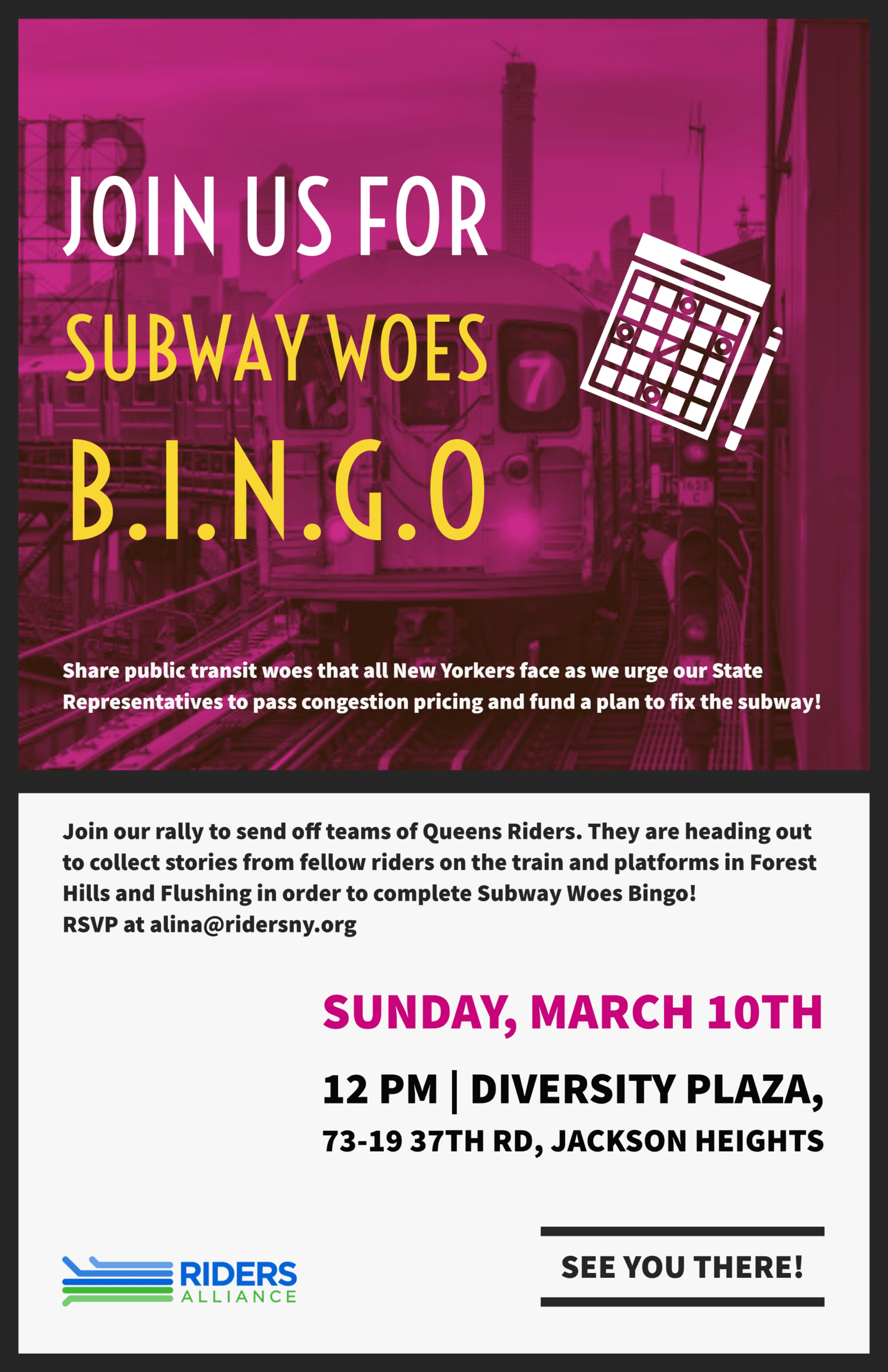 On Sunday, March 10th, we will rally before breaking up into teams and heading to the 7 and R trains into Forest Hills and Flushing where riders will collect rider experiences in an attempt to fill a Bingo Board filled with categories such as Bus Issues, Accessibility, and Overcrowded Platforms. Individual riders who win “Bingo” will get prizes for their woes.