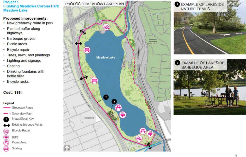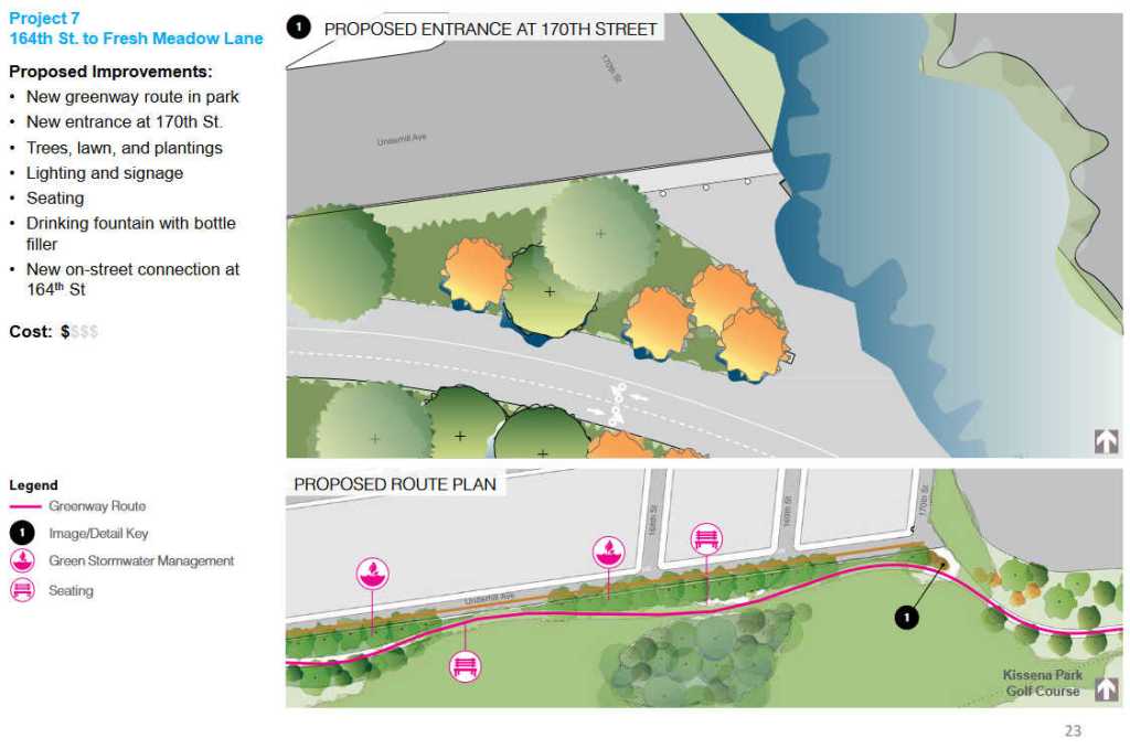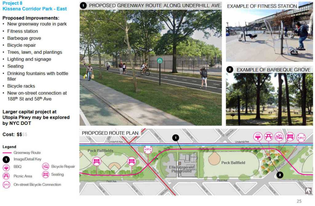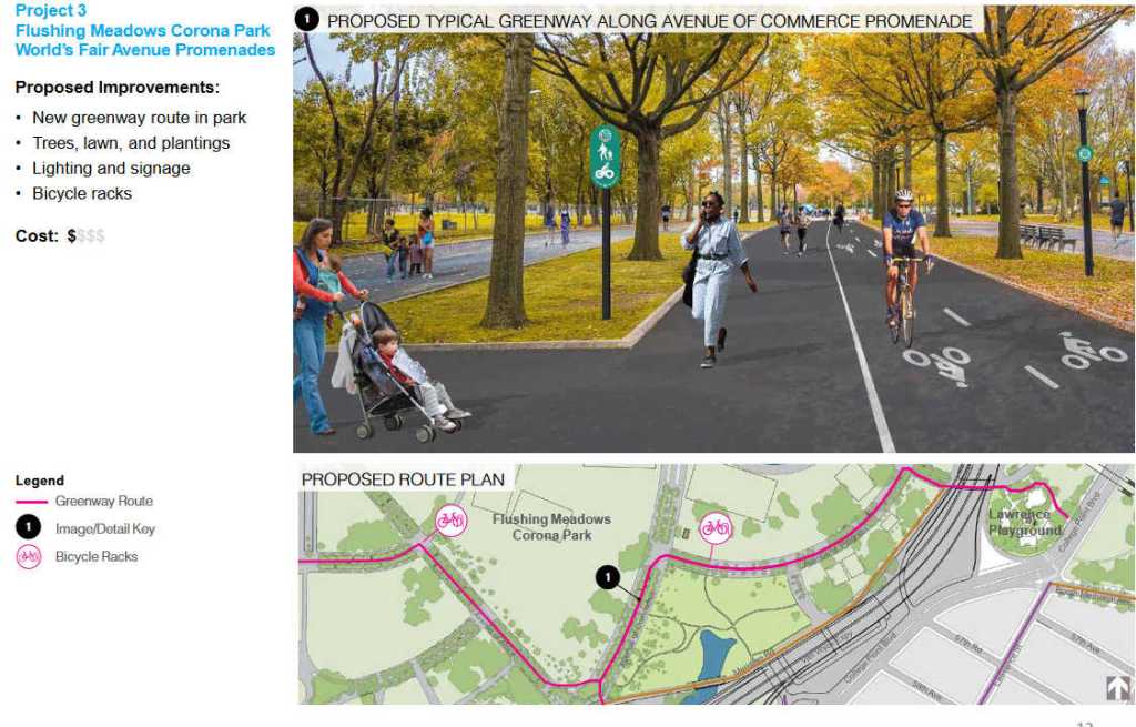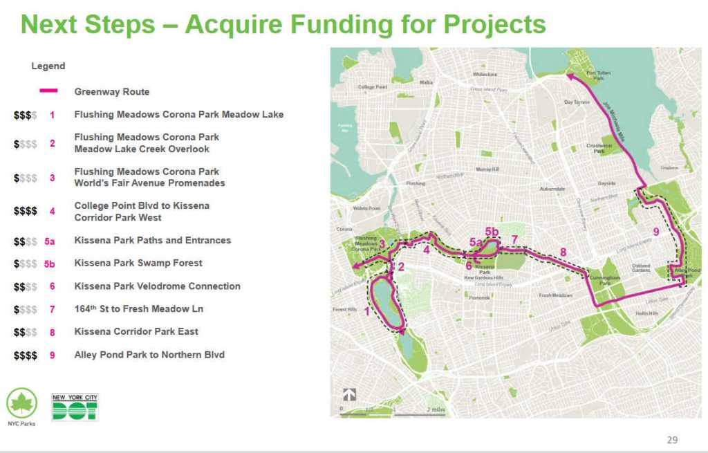 The Parks Department’s plan for just the Eastern Queens Greenway is pricey, but there is a lot of amazing infrastructure that comes with it. Funding for greenways keeps money in our neighborhood and increases the value of our parkland for everyone. This is how the Parks Department plans to connect our communities (with our comments in green italics).