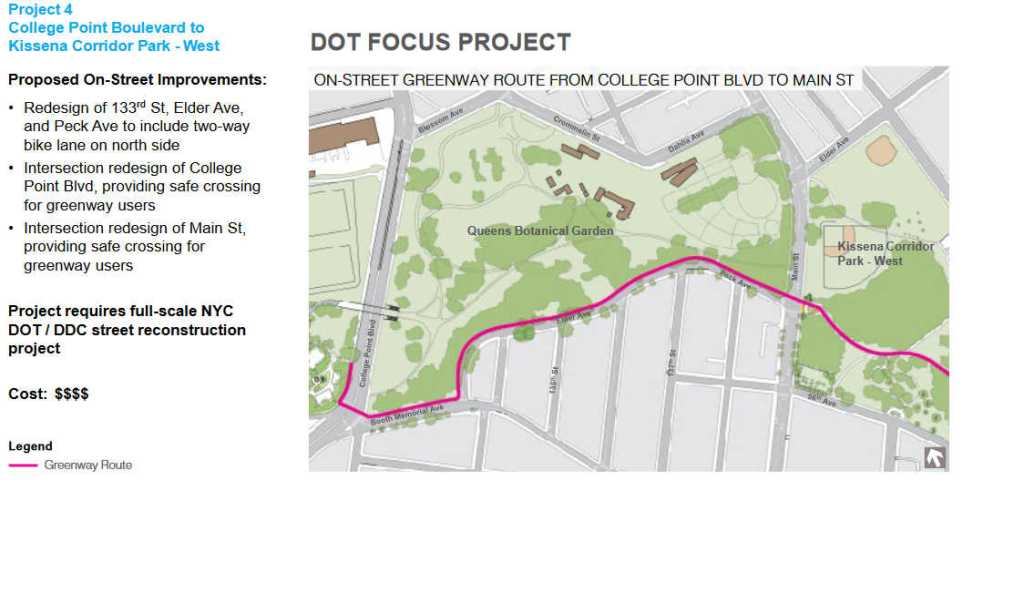 (The route around the Botanical Gardens is currently one of the biggest barriers on the entire greenway due to the lack of signage and very dangerous streets. The audience from the presentation rated this the most important segment to focus on. We agree that this needs to be prioritized, but we can’t understand why the Parks Department won’t use the College Point Bridge. Just two years ago, Justin Leiva (who was only 29) was killed by a driver while crossing this College Point Boulevard / Booth Memorial Avenue intersection. By removing the stairs on the eastern side and adding a ramp this becomes ADA compliant and a far safer route for everyone then trying to cross the highway-like College Point Boulevard. We’re not the only ones that feel this way, Evie Hantzopoulos the Botanical Garden Executive Director rightfully points out that we can do much better for our community.