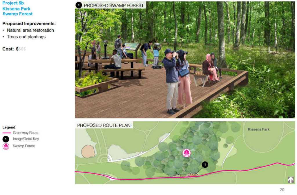 – move the greenway out of the swamp and up onto a new boardwalk on the raised path