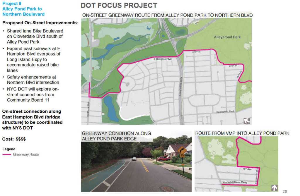 (A common complaint that we hear is people getting lost in Alley Pond. We really hope this route will help solve that issue. Outside of the park most of the route is already parking protected, but the proposed bike boulevard probably will not be, which is concerning to new riders even though there is very low traffic on those streets. Extending the sidewalk over the LIE is a great idea, though we’re concerned that the State DoT won’t be interested in that type of project, after hearing the highway widening work they’re planning under Oceania. The biggest win here are the improvements at Northern Boulevard, which has already been a major step forward, but still needs some work to truly serve the community.)