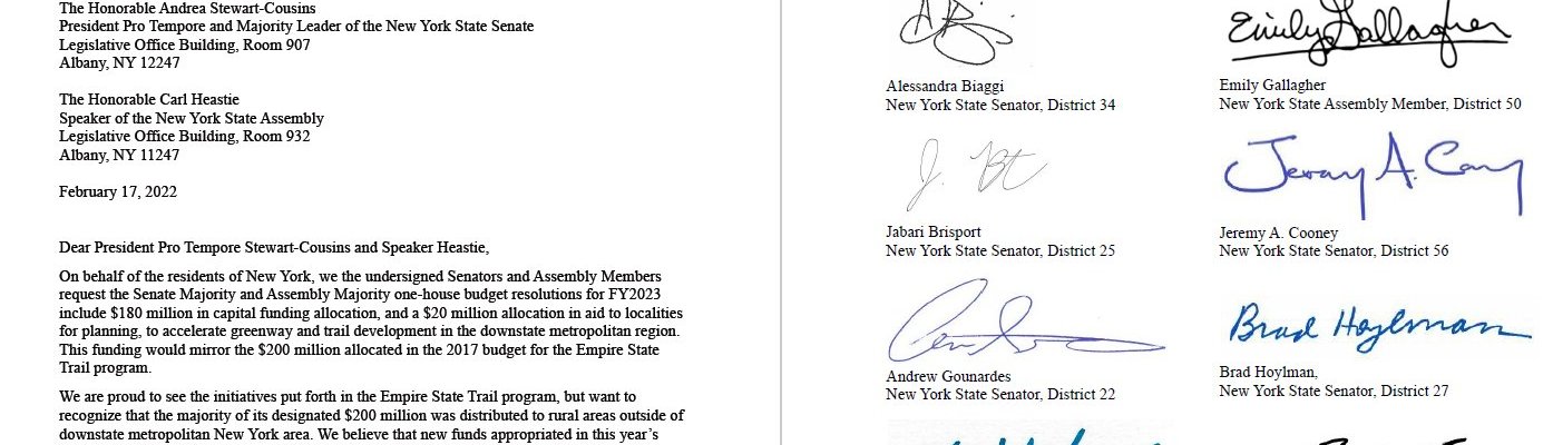 John came to partner with us to improve our greenways as soon as he was elected, before he even took office! He’s a long distance cyclist so he understands how local paths are designed (and should be redesigned). Last year he even rode up to Albany to vote along part of the Empire State Trail. (Connecting downstate greenways would certainly help that commute.)
