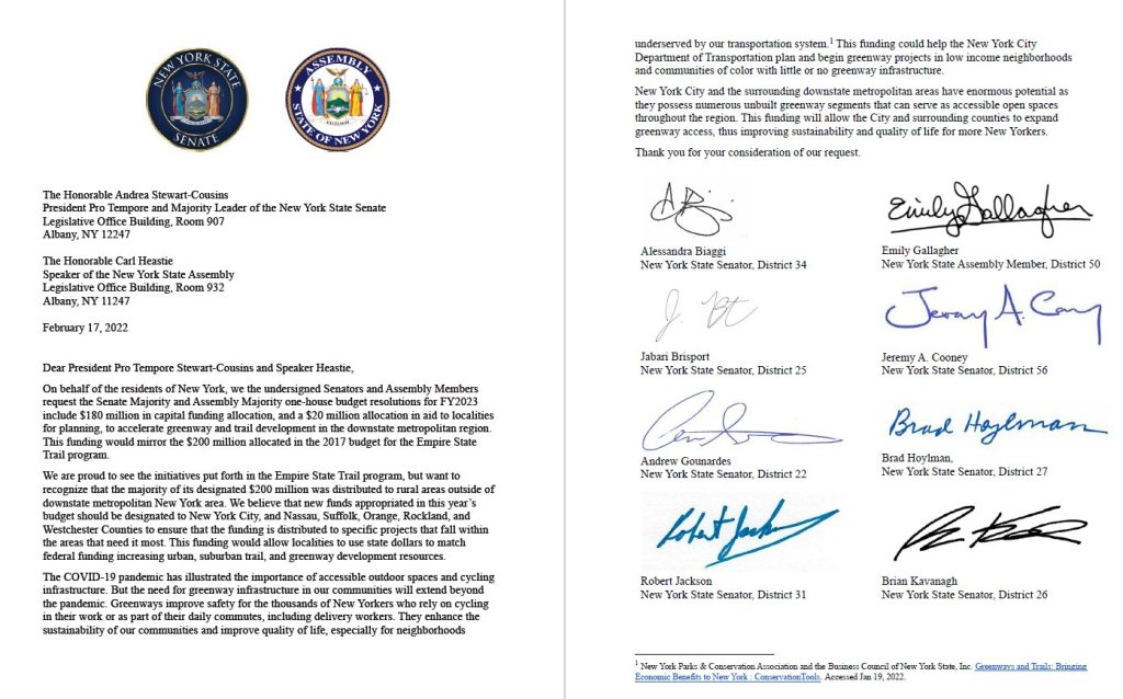 Most importantly, our local politicians are onboard and willing to put their money where their mouth is. Since $200 million has been dedicated to building the upstate Empire State Trail, our local politicians want $200 million for downstate greenways to connect our more urban communities. State Senator Alessandra Biaggi (Bronx) and Assembly Member Emily Gallagher (Williamsburg) pulled together an amazing coalition of 39 local politicians calling for these funds to help our communities. You can read the full letter here: