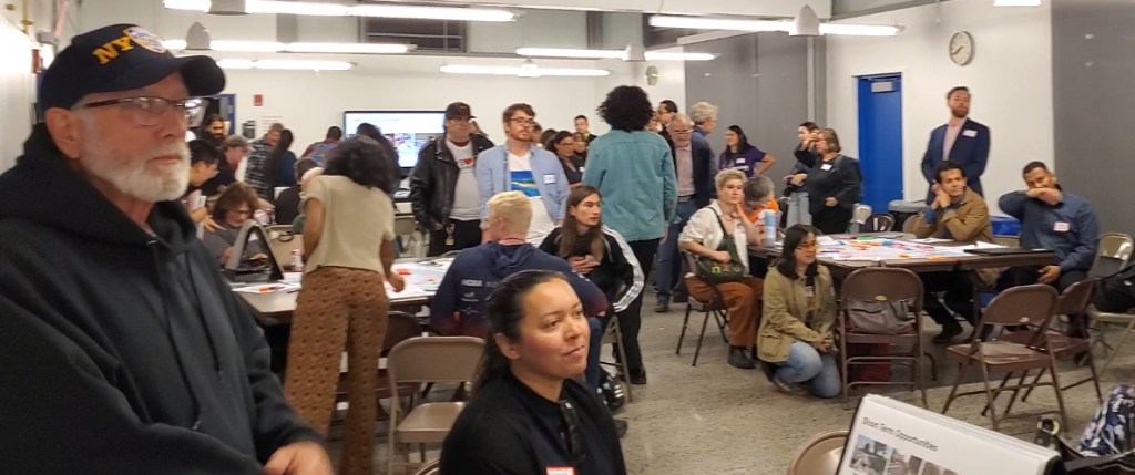 Unfortunately, she soon announced that while she liked bikes, no one used the bike lanes. This started an uproar. Half the room, including myself, had ridden to the meeting using bike lanes and the other half yelled their approval of her statement. She went on to say that everyone should be civil and save their comments for the individual planning sessions that were being held at half a dozen large tables. But, the people who supported her mostly didn’t join the discussions at the tables led by DOT staff members. Instead, they roamed between tables, making critical comments, such as why do you need a bike lane to see the waterfront when there is no waterfront access? What this statement meant was unclear, and no suggestions were made by this group.