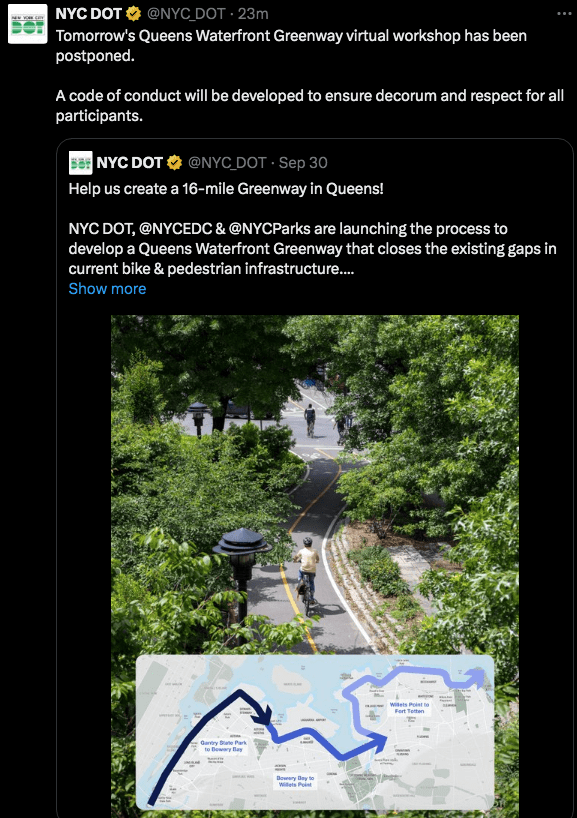 […] meeting was managed very well, you can watch it yourself here. There were no bad actors like at the Northern Queens Greenway meeting a few weeks before. The only real friction was a few neighbors asking about the City’s […]
