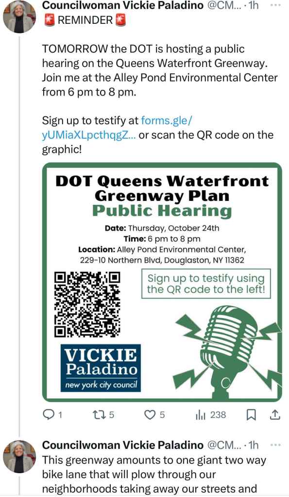 After the StreetsBlog article was posted, Warren Schreiber made a comment that seemingly supports Vickie Paladino and claims the original article was not factual. Warren is the President of Queens Civic Congress and the Second Vice Chairperson of Community Board 7. We’d love to hear specifically what Warren thinks is objectively incorrect, instead of just his opinion that he doesn’t like the facts presented.
