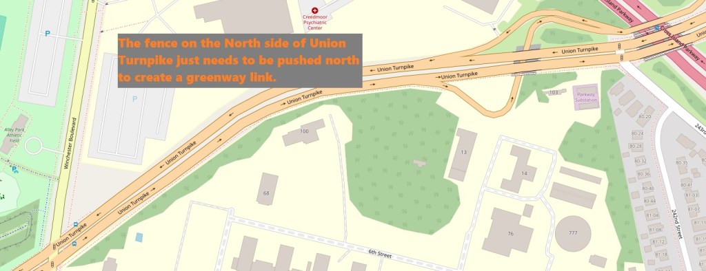 A brief trail along Union Turnpike, from Winchester Boulevard to Commonwealth Boulevard, would make it safer and easier for students to get to and from the Padavan Campus and provide safer connectivity between Glen Oaks and the greenway network. This would require collaboration with the governor’s office and the relocation of the Creedmore Fence.