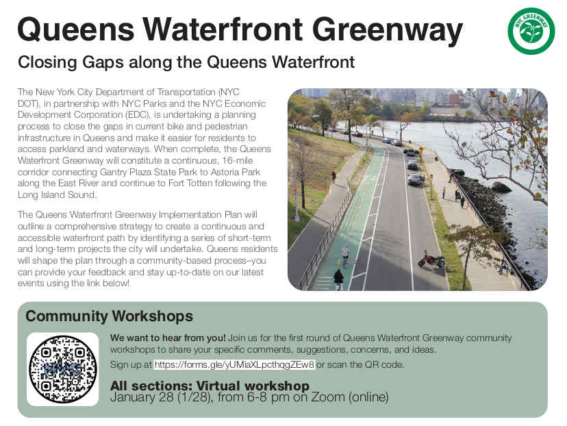 After a brief delay, we are excited to announce the upcoming virtual workshop for the Queens Waterfront Greenway plan. The event will take place on-line at: