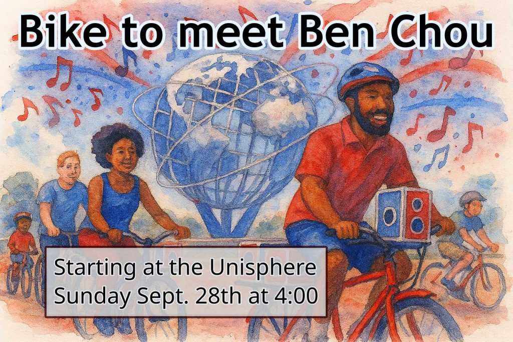 City Council Candidate Ben Chou reached out to speak to us about how to improve the streets around District 19 (Whitestone, College Point, Bayside, Little Neck, Douglaston, and parts of North Flushing). We’re going to run a bike ride from the Unisphere to his party with the QCYD this Sunday and we’d like you to come to share your thoughts.