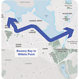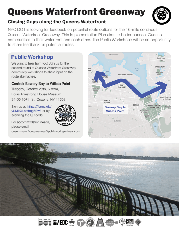 Less than a week remains before a pivotal community workshop that will shape how Queens connects to its waterfront. NYC DoT will present Round Two of planning for the Northern Queens Waterfront Greenway which will eventually create a safe connection from the East River with Fort Totten. Tuesday night we’ll be discussing the central segment running from Bowery Bay to Willets Point.