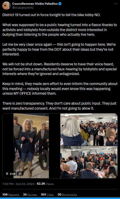 Paladino has drawn criticism for a series of inflammatory public comments that opponents and some colleagues say raise concerns about temperament and public safety. In May 2024, during demonstrations on college campuses over the war in Gaza, she described student protesters as “monsters” who must be “slayed”, language that many saw as violent and dehumanizing. In January 2025 she posted on X, in response to reporting about illegal sidewalk parking, that “you can just tell when a guy has never been punched in the face.” More recently, in June 2025 she called for the deportation of Assemblymember Zohran Mamdani in an X post. Vickie also walked out of a public input session DoT was hosting on the Northern Queens Waterfront Greenway to say…that the process had no public input.