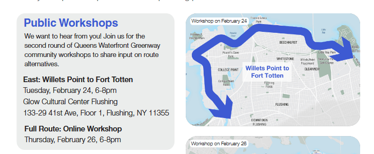 The Department of Transportation (DoT) is coming to Eastern Queens again to get feedback from you about the proposed Queens Waterfront Greenway. As you’ll remember, this will be a family safe path from Fort Totten all the way to Gantry State Park (where the midtown tunnel is), as much as possible following the bay. As… Read More Tell DoT Where You Want the Queens Waterfront Greenway